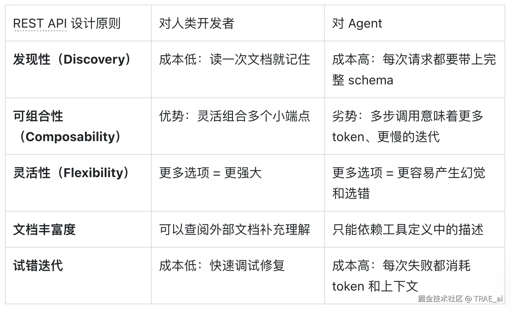 传统 REST API 是为人类开发者设计的,我们假设开发者会阅读文档、理解上下文、在出错后调试代码,但 Agent 是完全不同的「用户」,它不会主动查阅文档,不擅长从上下文中推断隐含信息,每次调用都需要从头开始理解工具的用途。