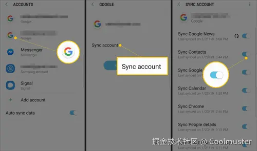 步骤 1. 在Android设备上,前往“设置”>“帐户”>“Google”>“同步帐户”,并确保启用“通讯录”同步。