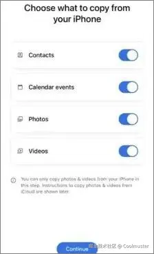Google 的“切换至Android应用(名为Android Switch”)现已在 Google Play 商店和 Apple App Store 上架,它简化了新Android用户的迁移流程。它允许您以无线方式传输消息、联系人、照片和日历。但是,此功能仅在Android设备的设置过程中有效。如果您已完成设置,请先将Android手机恢复出厂设置。另外,请务必备份重要数据。