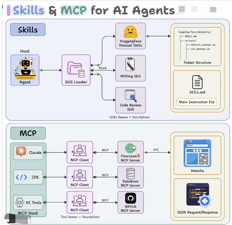 为了实现这一能力,需要一套机制让 AI 能够发现工具、理解工具参数,并以标准化方式调用这些工具。MCP 与 Skills 正是在这一背景下逐渐形成的两种主流方案。