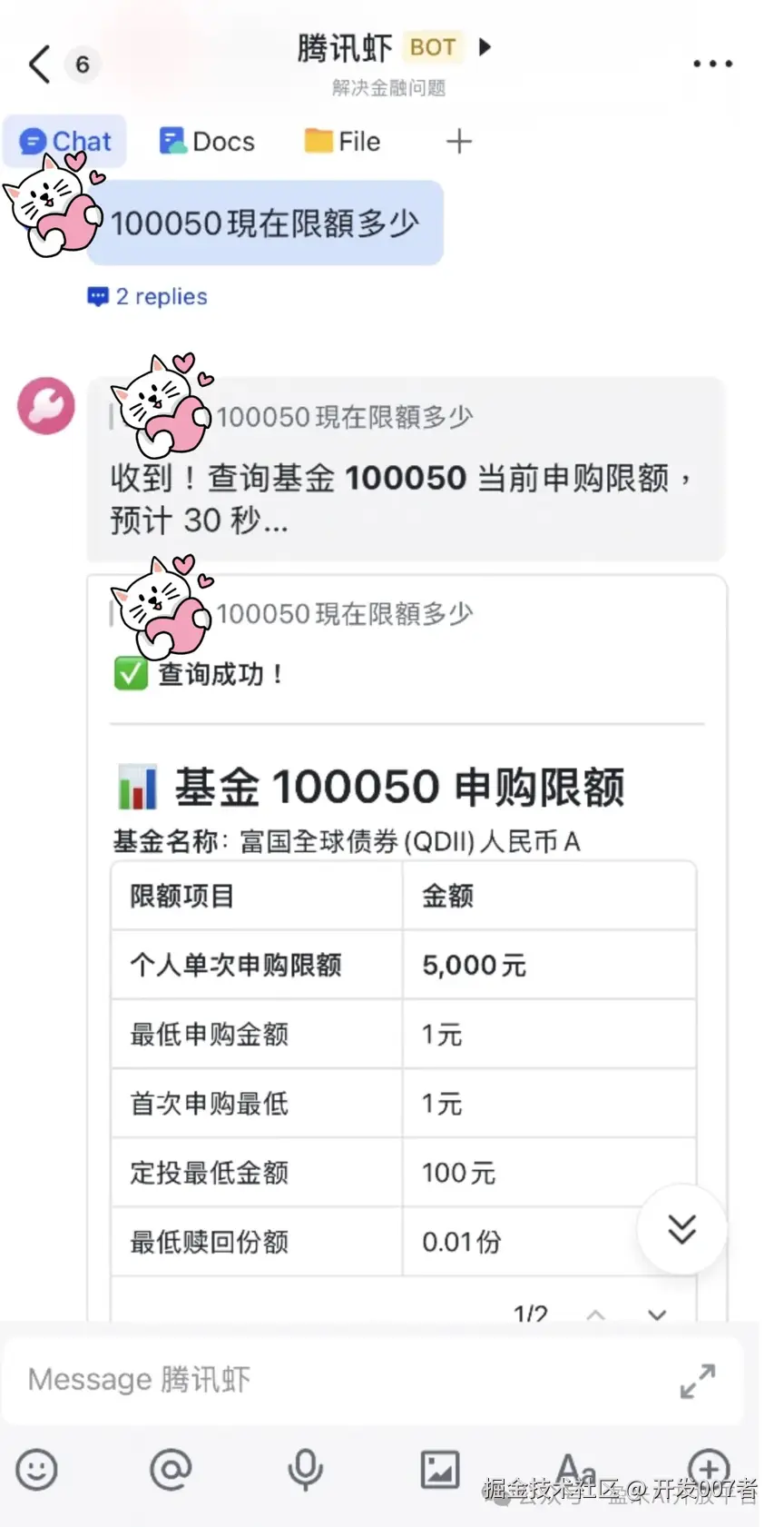 仅需 30 秒,龙虾就精准返回该基金最新的限购详情,包括最低申购额、首次最低申购额和定投最低申购额等不同维度。