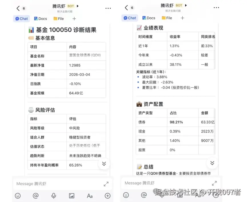 (图|飞书龙虾界面,内容由 AI 大模型生成,所提及的具体基金单品、投资策略仅作释义,不作为任何投资建议。)