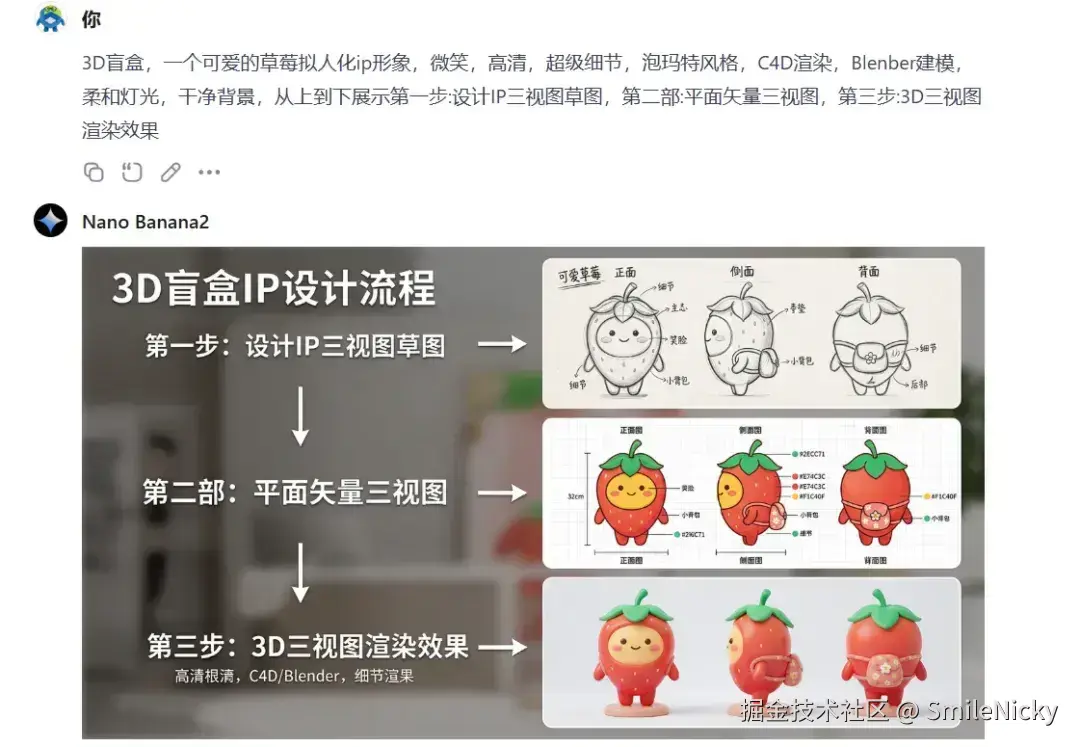 【3D盲盒,一个可爱的草莓拟人化ip形象,微笑,高清,超级细节,泡玛特风格,C4D渲染,Blenber建模,柔和灯光,干净背景,从上到下展示第一步:设计IP三视图草图,第二部:平面矢量三视图,第三步:3D三视图渲染效果】