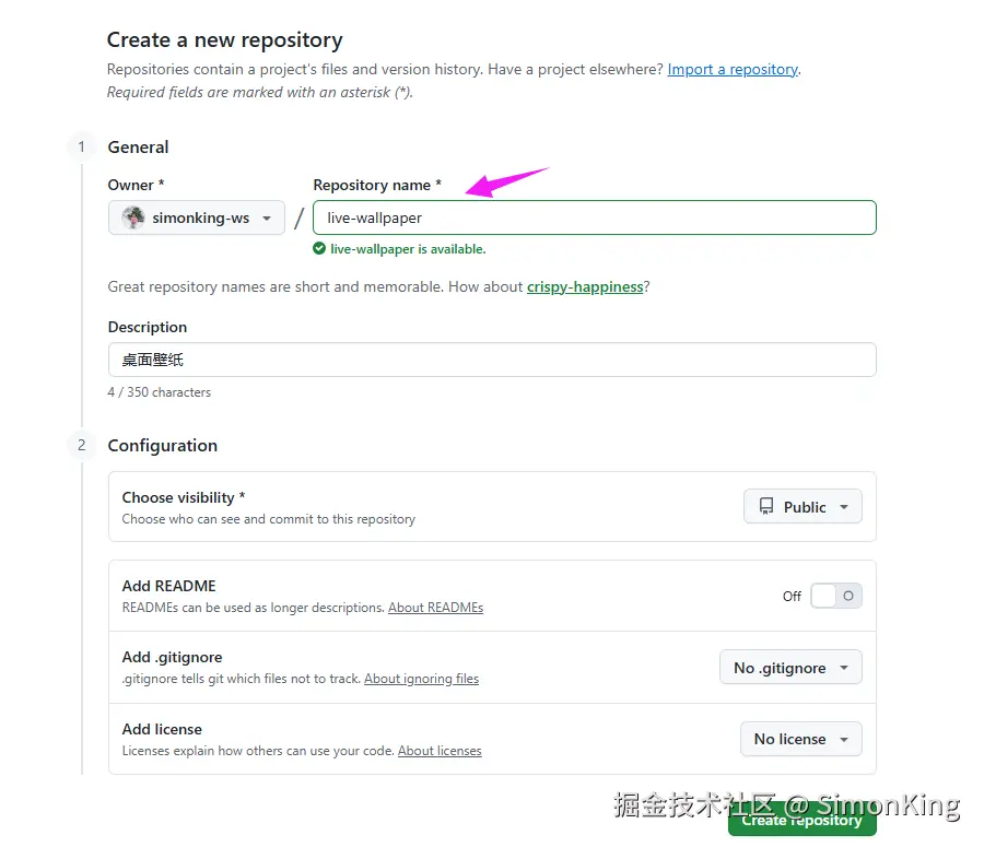 登录 GitHub,点击右上角加号图标,选择 New repository(新建仓库)。填写对应的信息即可,如图: