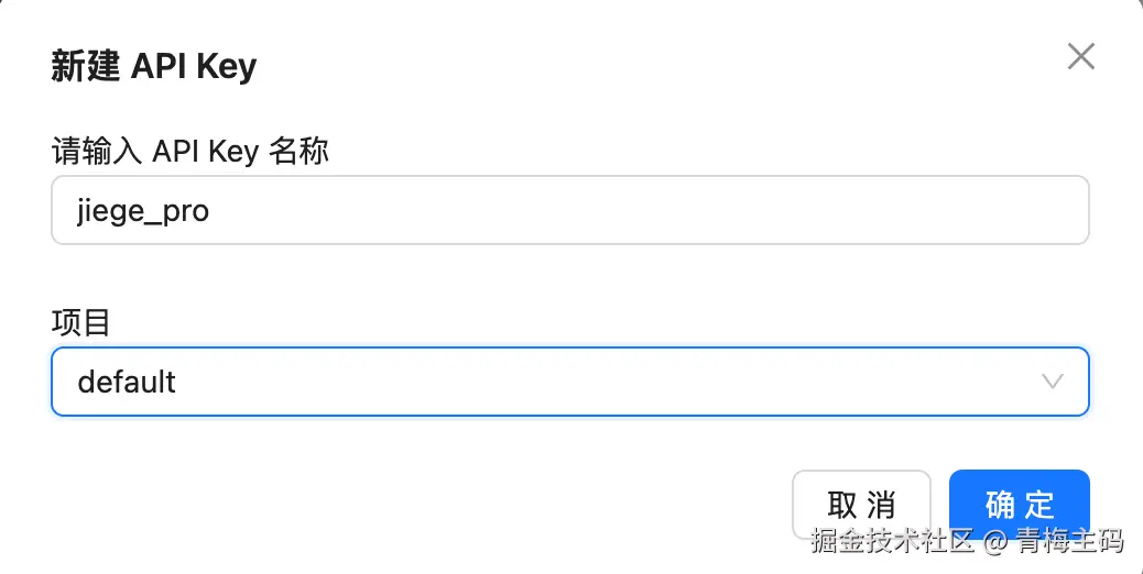 先去 https://platform.moonshot.cn/console/api-keys 创建一个 API Key,创建方式很简单。点击创建 API Key,填入 API Key 名称,选择项目为你自己的项目,也可以直接选择 default。