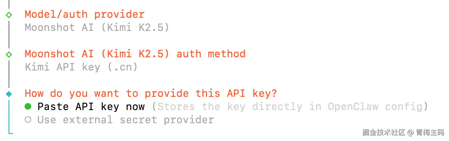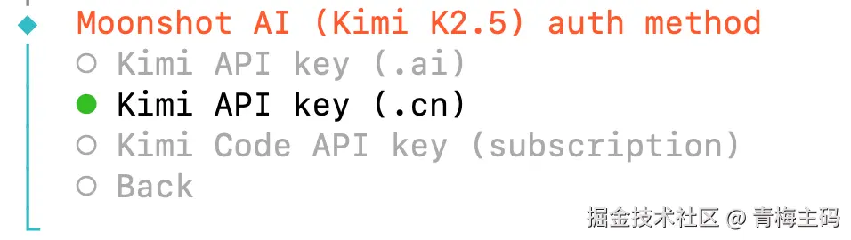 注意!!Moonshot AI (Kimi k2.5) auth Method 一定要选择第二个:.cn。