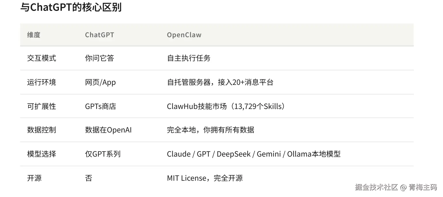 而 OpenClaw 完全不一样! 它不仅仅只是问答,而是真正会动手干活的 AI!它的工作领域已经不局限在处理一次对话或者一次请求上面了。