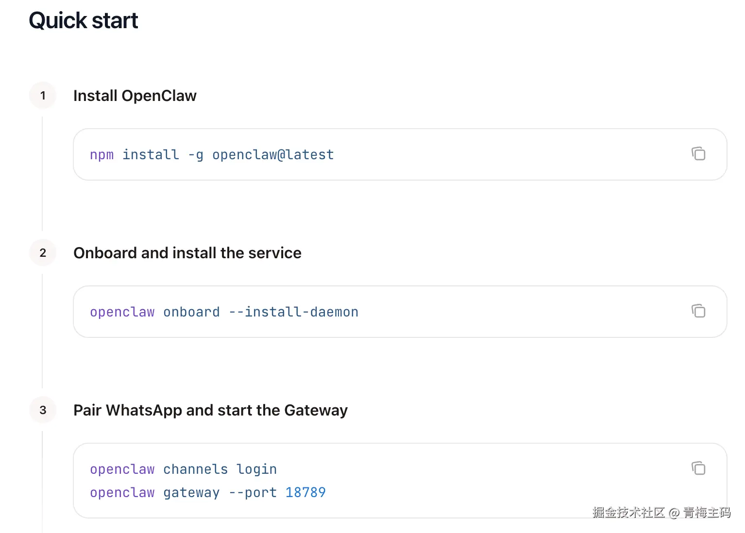 通用的安装步骤可以根据官网https://docs.openclaw.ai/#quick-start的操作步骤,很快就可以安装在自己的本地了。