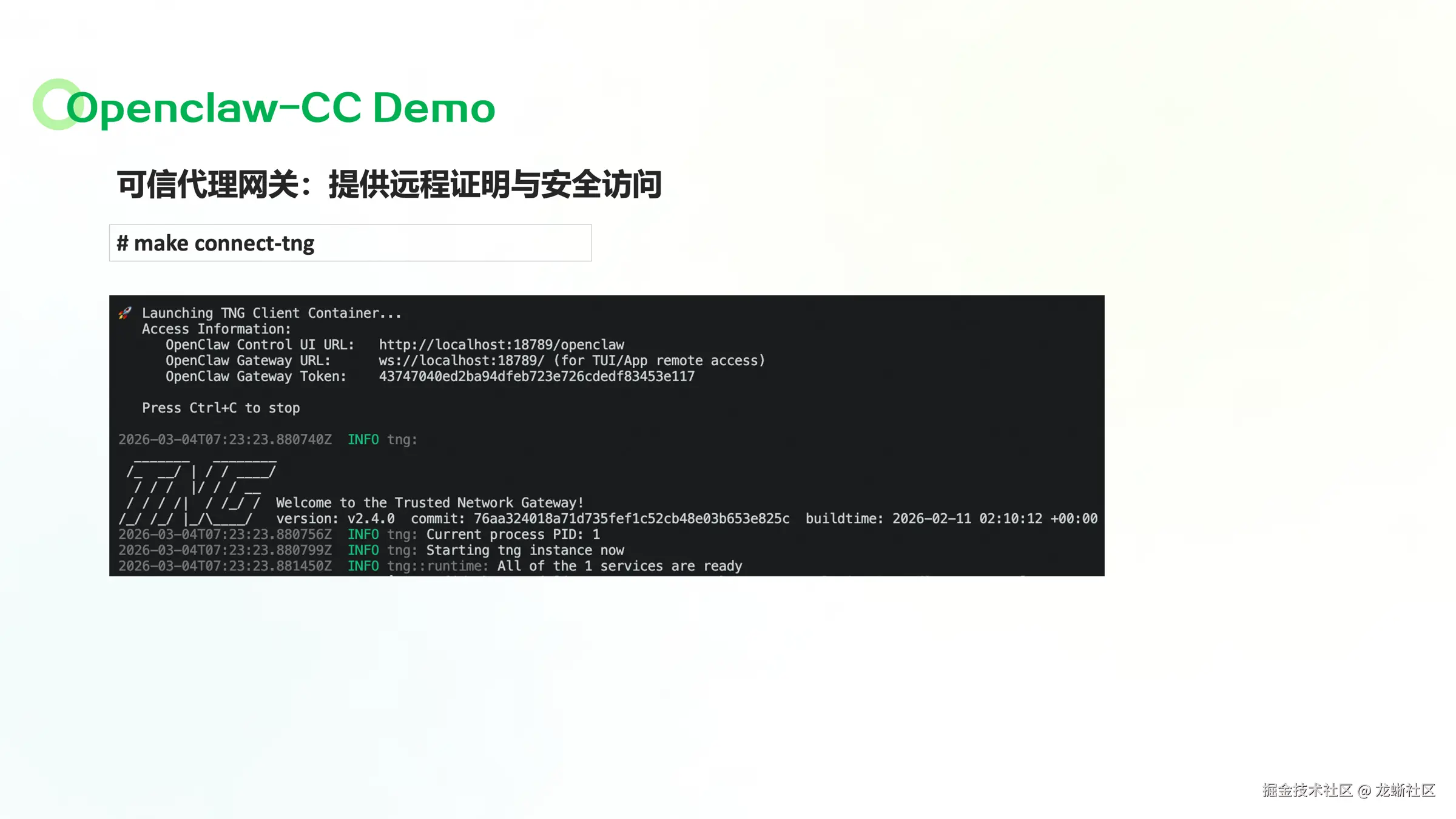第三步:可信代理网关与安全接入。启动本地的 TNG(Trusted Network Gateway)客户端,发起远程证明请求。TNG 会验证云端的 TDX Quote,确认环境清白,并建立端到端的加密隧道。验证通过后,用户可通过多种方式安全访问 Agent。