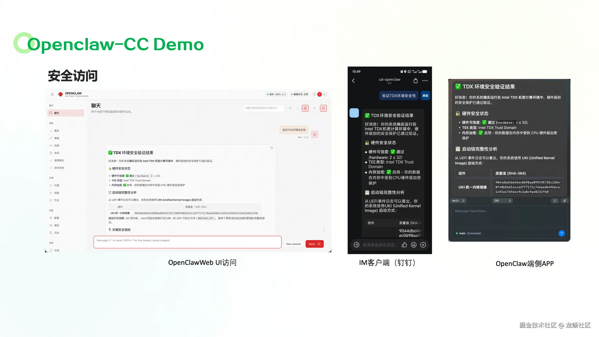 编者按:随着人工智能大模型在金融、医疗、政务等高敏感领域的深入应用,数据隐私与模型安全已成为制约 AI 落地的核心瓶颈。如何在不可信的公有云环境中,确保 AI 的“思维过程”不被窥探、“执行逻辑”不被篡改、“通信链路”不被劫持?近日,英特尔中国高级工程师朱运阁与龙蜥社区云原生机密计算 SIG Contributor 赖堃共同带来了《智算新范式:构建 Confidential AI Agent》的主题分享。他们基于Intel® TDX(可信域扩展)技术与龙蜥社区开源生态,深度解析了 OpenClaw-CC 项目的架构设计与落地实践,展示了一套从硬件根信任到应用层隔离的全栈机密计算解决方案。本文整理自龙蜥大讲堂第 144 期直播内容,为您系统化拆解如何构建“可用不可见”的机密智能体。