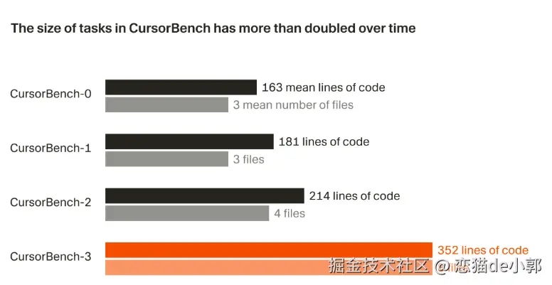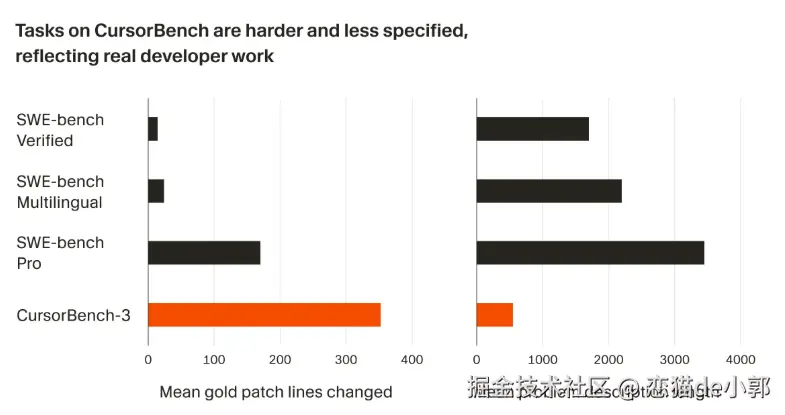从初始版本到现在的 CursorBench-3 版本,正确性评估中的问题范围大约翻了一番,无论是代码行数还是平均文件数都显著增加,也就是 CursorBench-3 的任务涉及的代码行数远超 SWE-bench Verified、Pro 或 Multilingual :