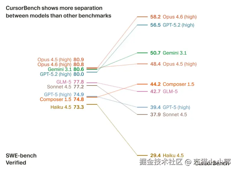 在这个结果上,Cursor 证明了 CursorBench排名 ≈ 真实使用排名 ,而结果确实也趋势基本一致,在线越好的模型场景, CursorBench 也高。