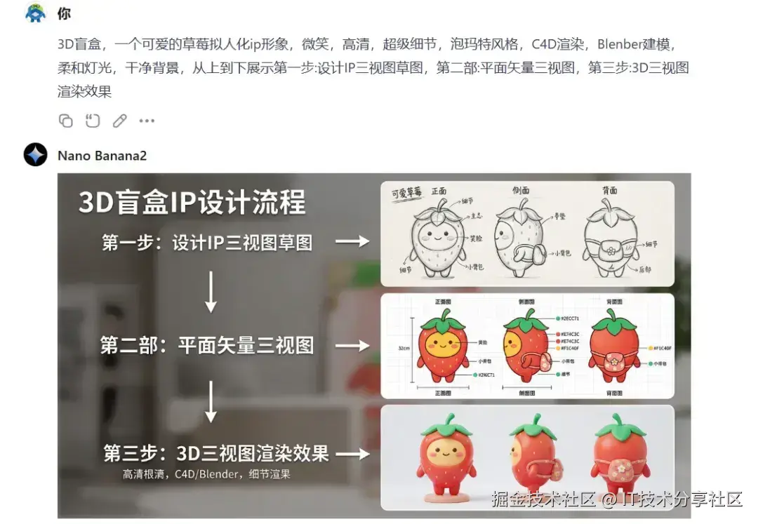 【3D盲盒,一个可爱的草莓拟人化ip形象,微笑,高清,超级细节,泡玛特风格,C4D渲染,Blenber建模,柔和灯光,干净背景,从上到下展示第一步:设计IP三视图草图,第二部:平面矢量三视图,第三步:3D三视图渲染效果】