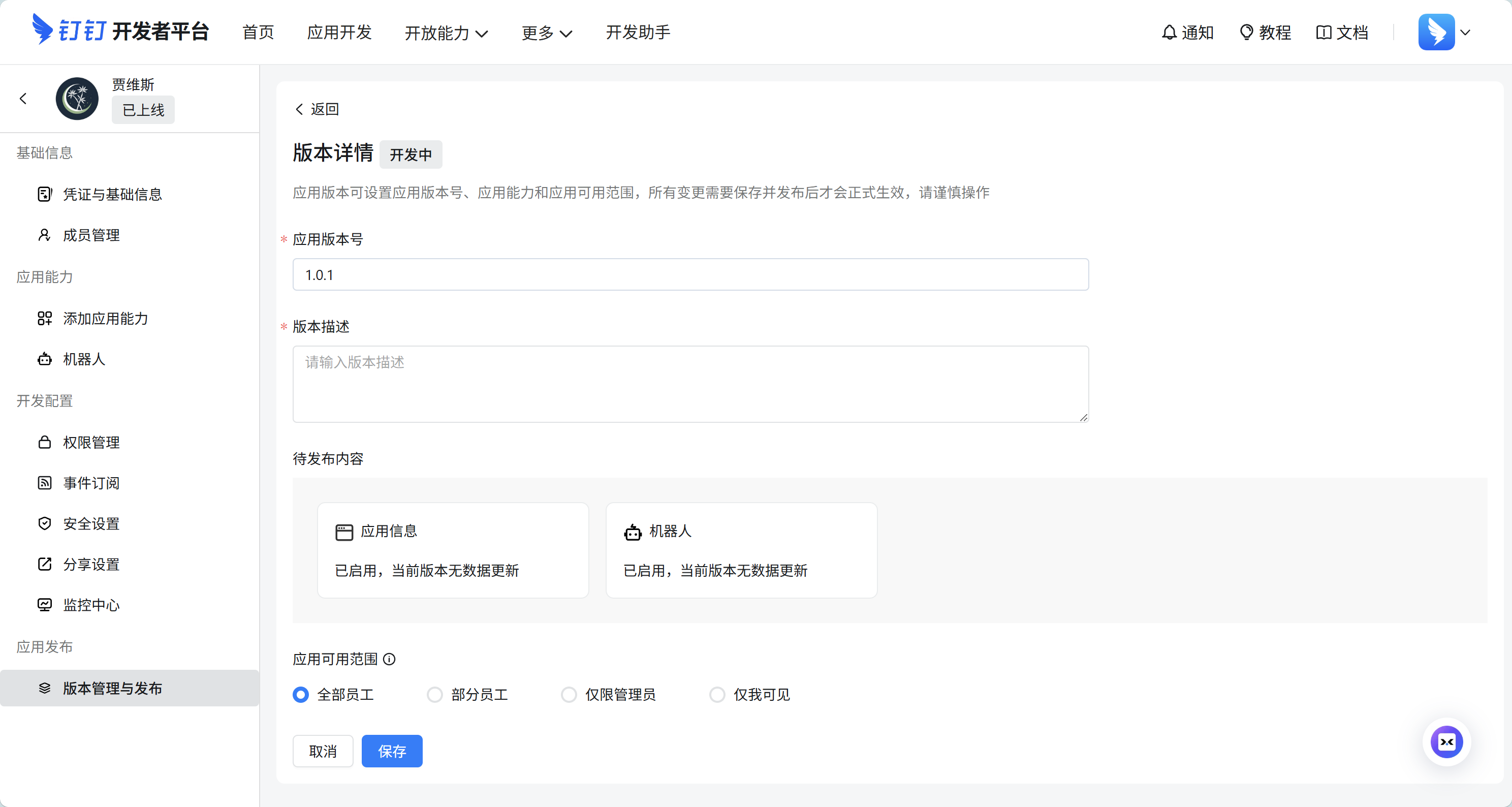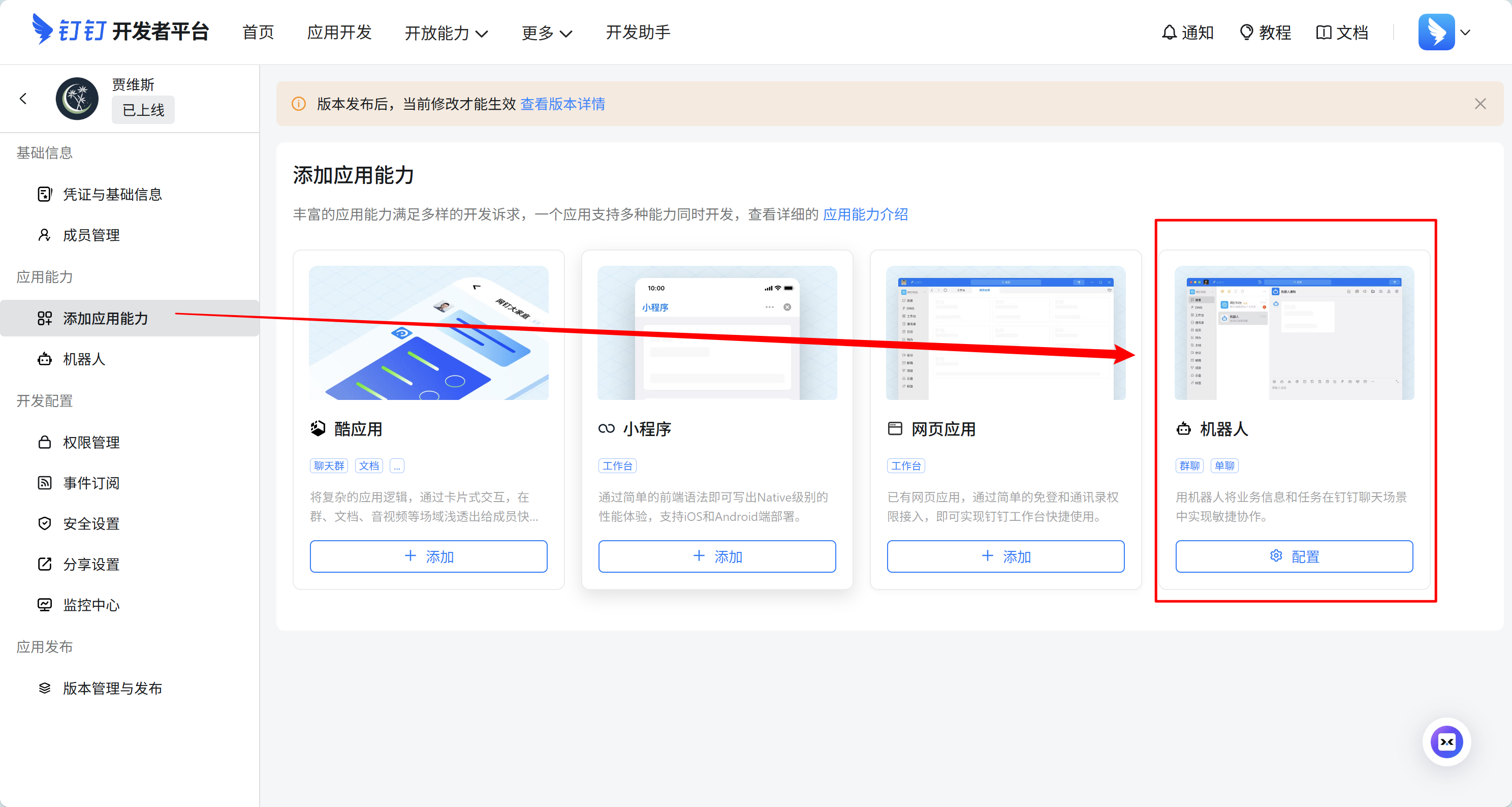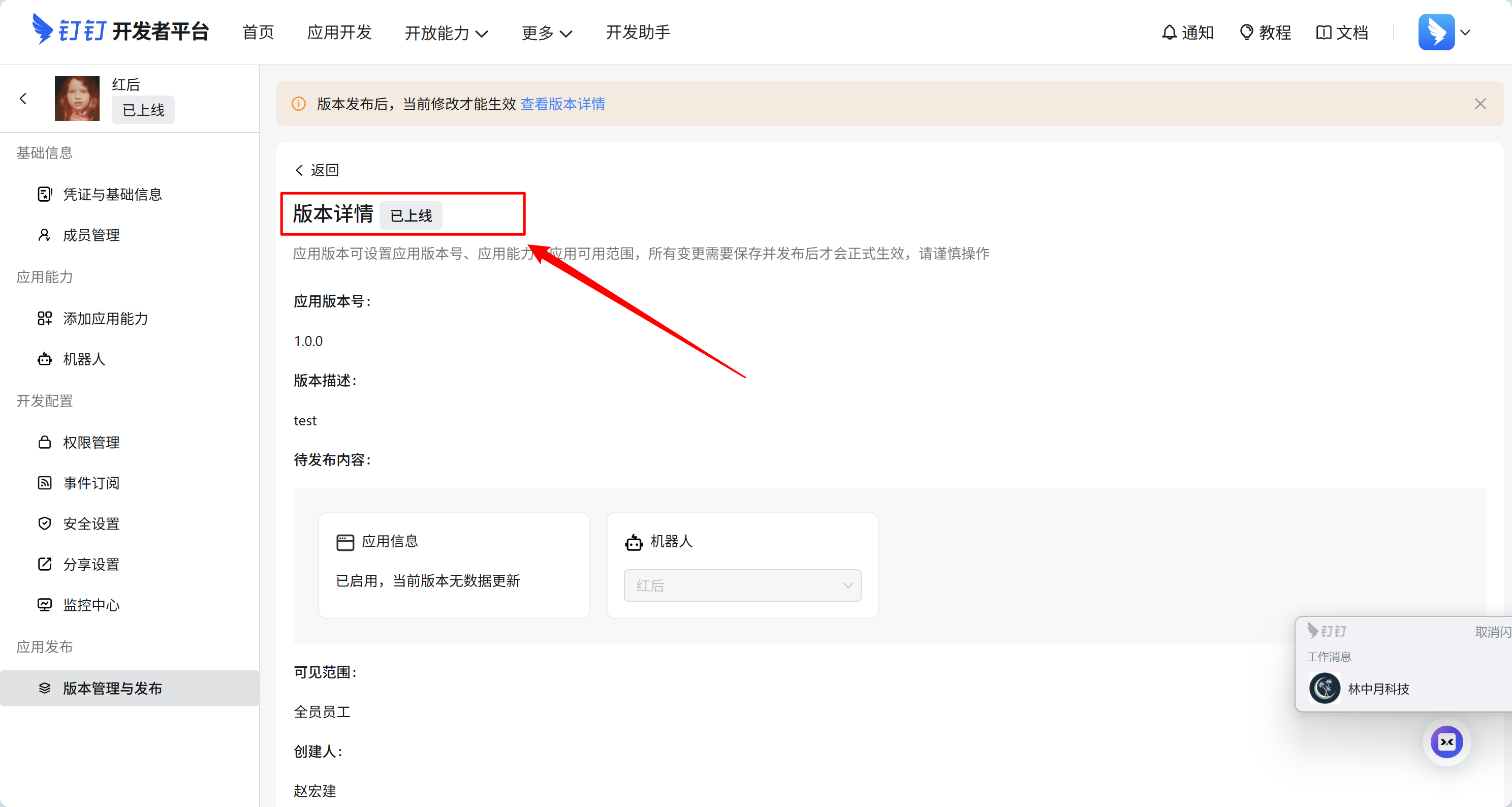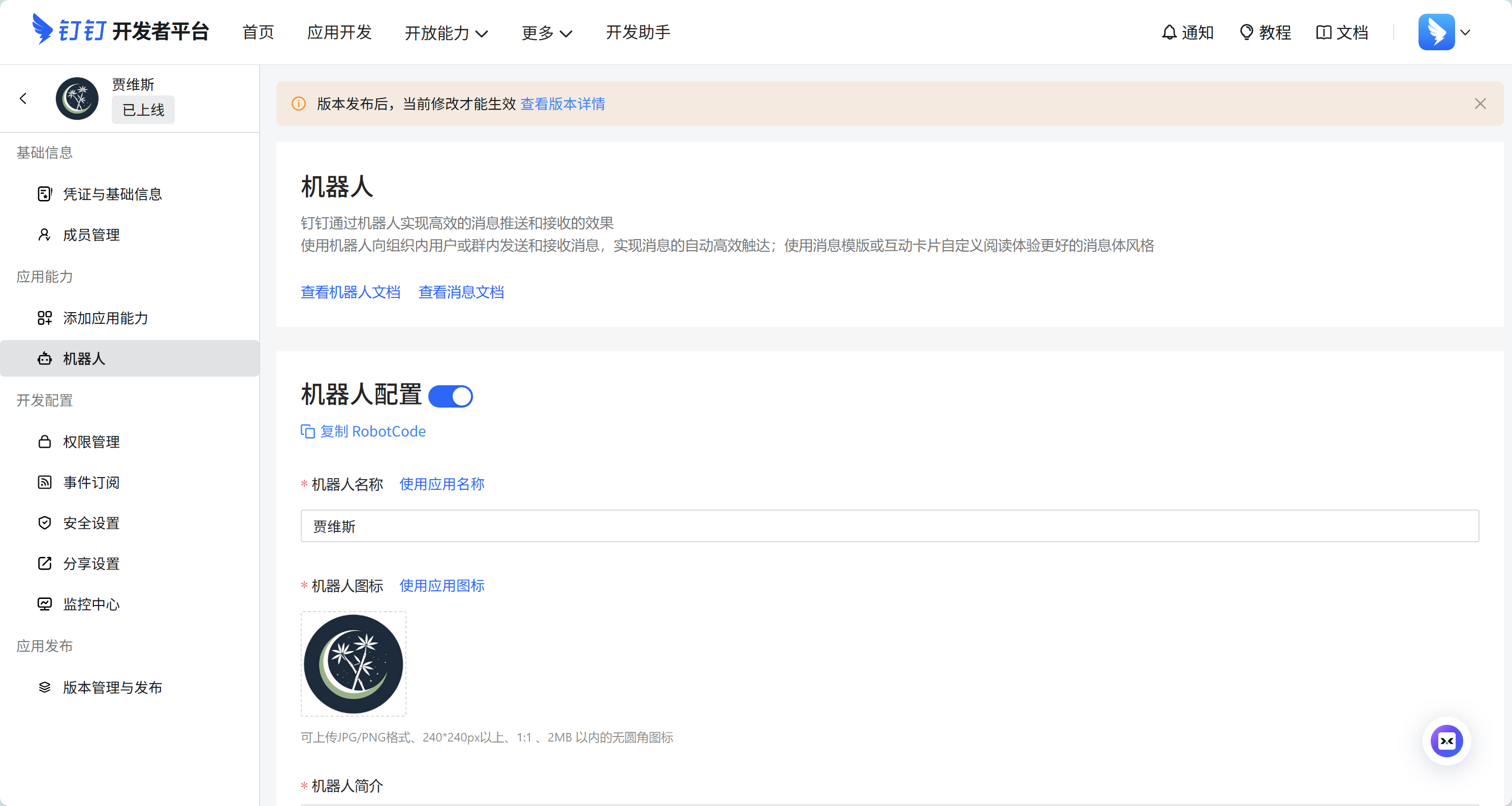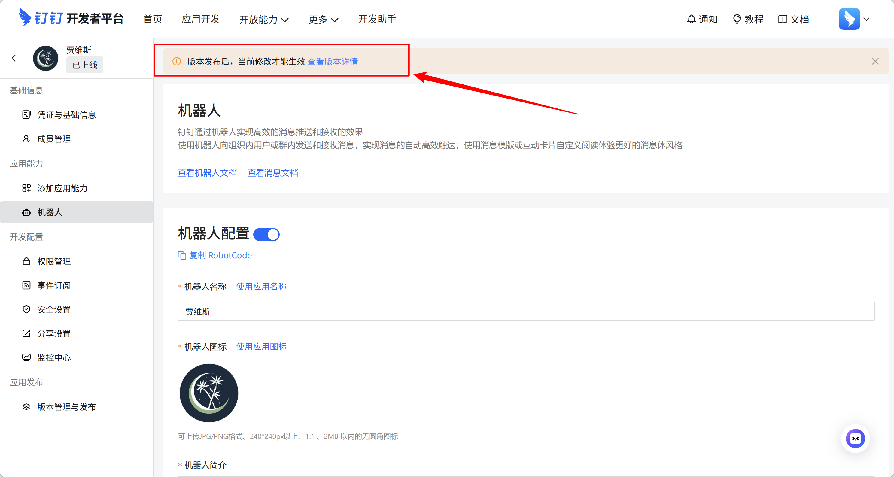 注意,机器人一定要先更改版本并发布,状态是已上线才可以