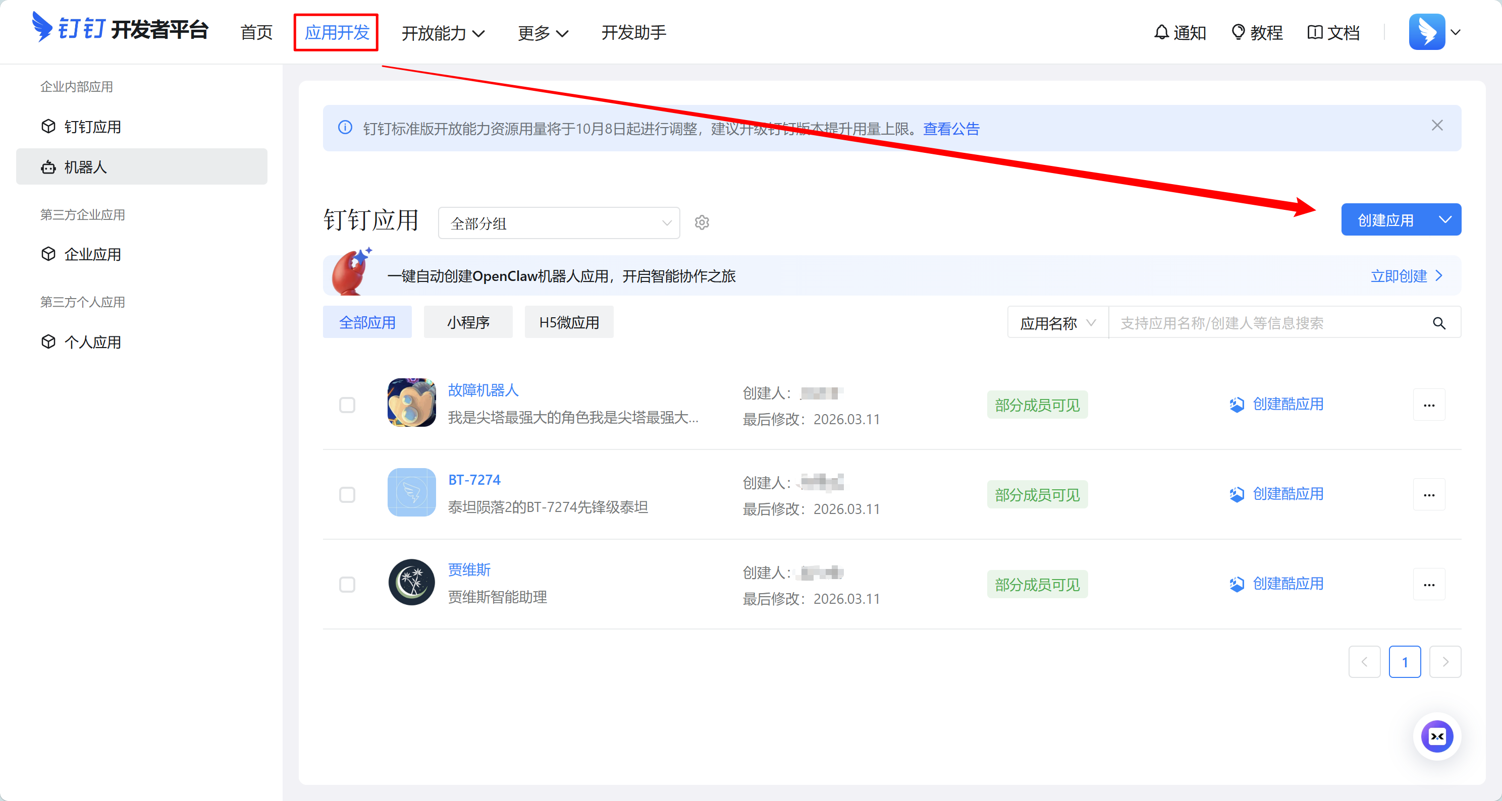 创建完的应用,在列表会出现,点击进入之后,按图中所示,创建机器人