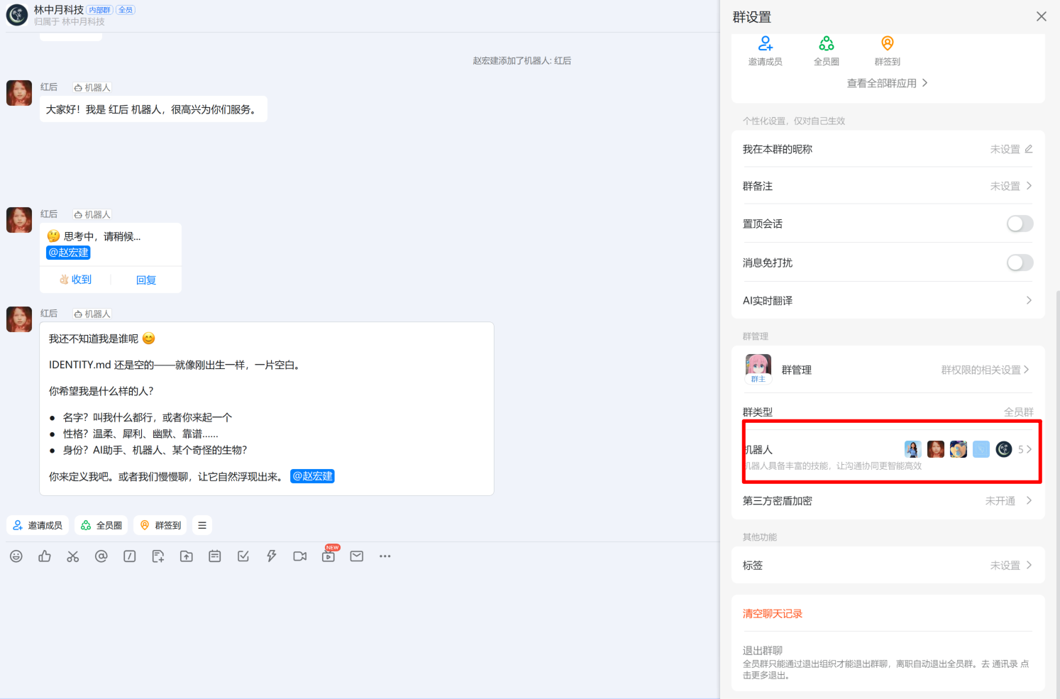 进入钉钉,刚刚创建了测试的企业,此时钉钉可以看到,建群之后可以在群管理里面找到机器人并拉入群聊。