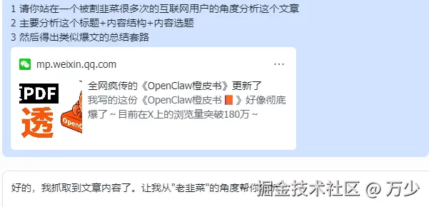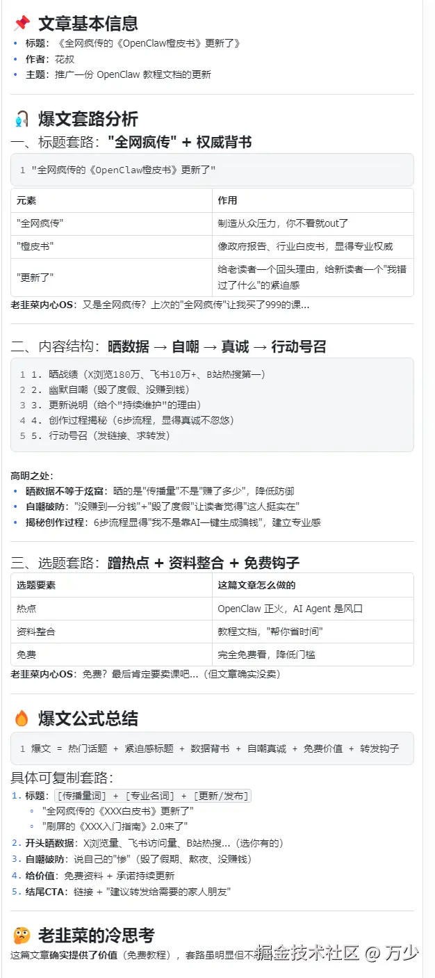 如果你也想写 OpenClaw 相关的文章,不妨参考一下花叔的“数据+自嘲”策略,或者坚持我的“干货+真诚”路线。 说不定你也可以参考这个思路,写出一个属于你的爆文分析 Agent!