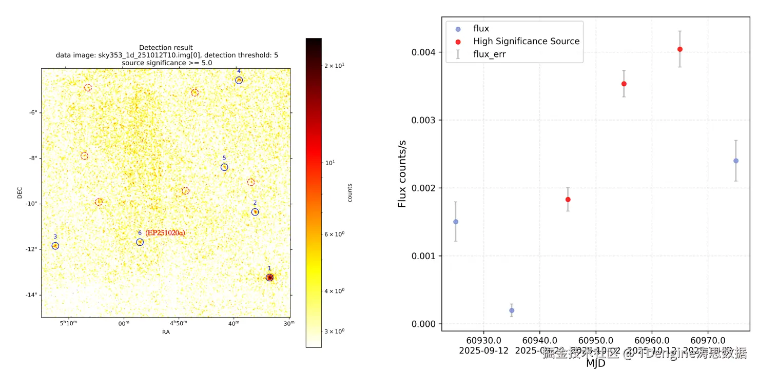 研究团队利用 FXT 和 Swift/XRT 进行的后续观测,进一步将 X 射线源精确定位到宿主星系的核区;同时,UVOT 观测到其亮度较历史记录显著增强,这些证据共同支持该事件属于潮汐瓦解事件。在 2025 年 9 月底,该源即通过光子数据库探测到信号,从而引起科研人员的注意。20 多天后,该天体接近本次爆发峰值,才被单次观测处理流水线正式探测到并被命名为 EP251020a。