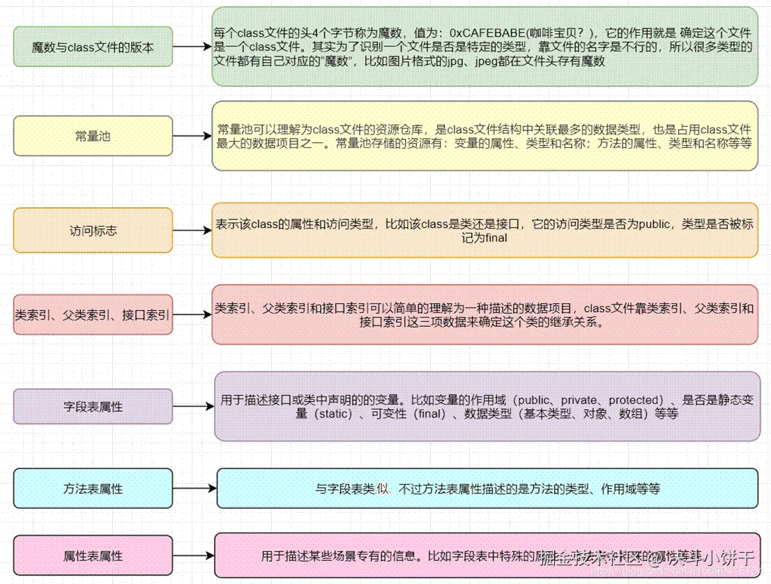 class文件本质上是一个以8位字节为基础单位的二进制流,各个数据项目严格按照顺序紧凑的排列在class文件中。jvm根据其特定的规则解析该二进制数据,从而得到相关信息。
