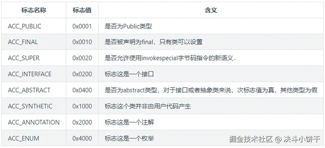 然后紧接着的是该类的访问标志:ACC_PUBLIC, ACC_SUPER,访问标志的含义如下: