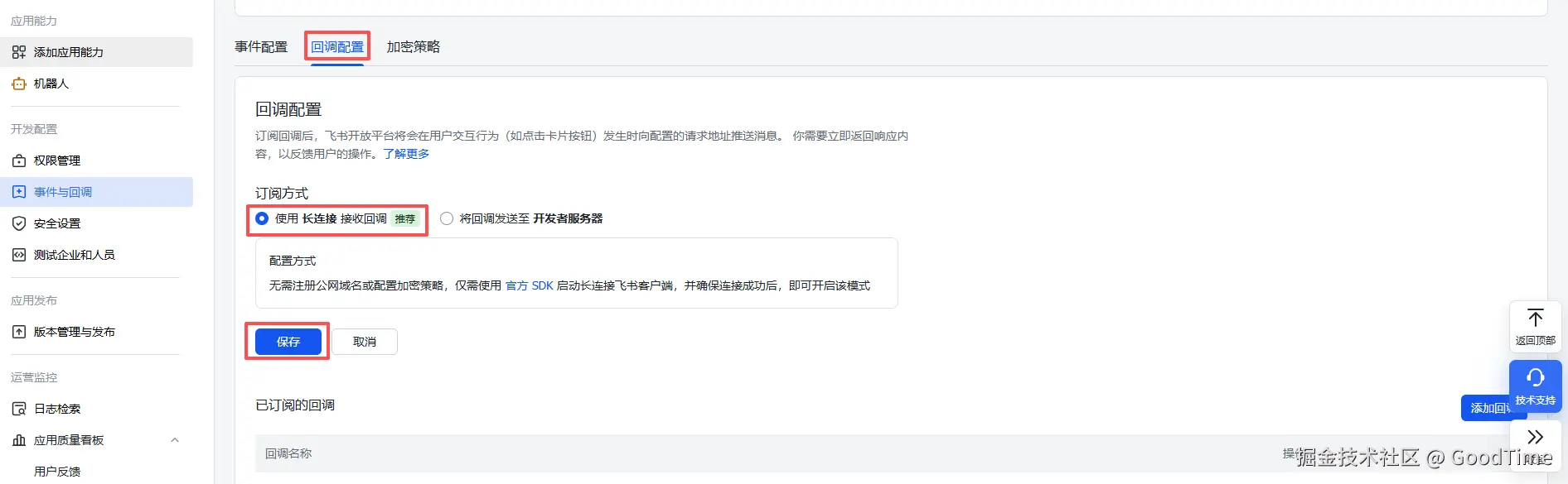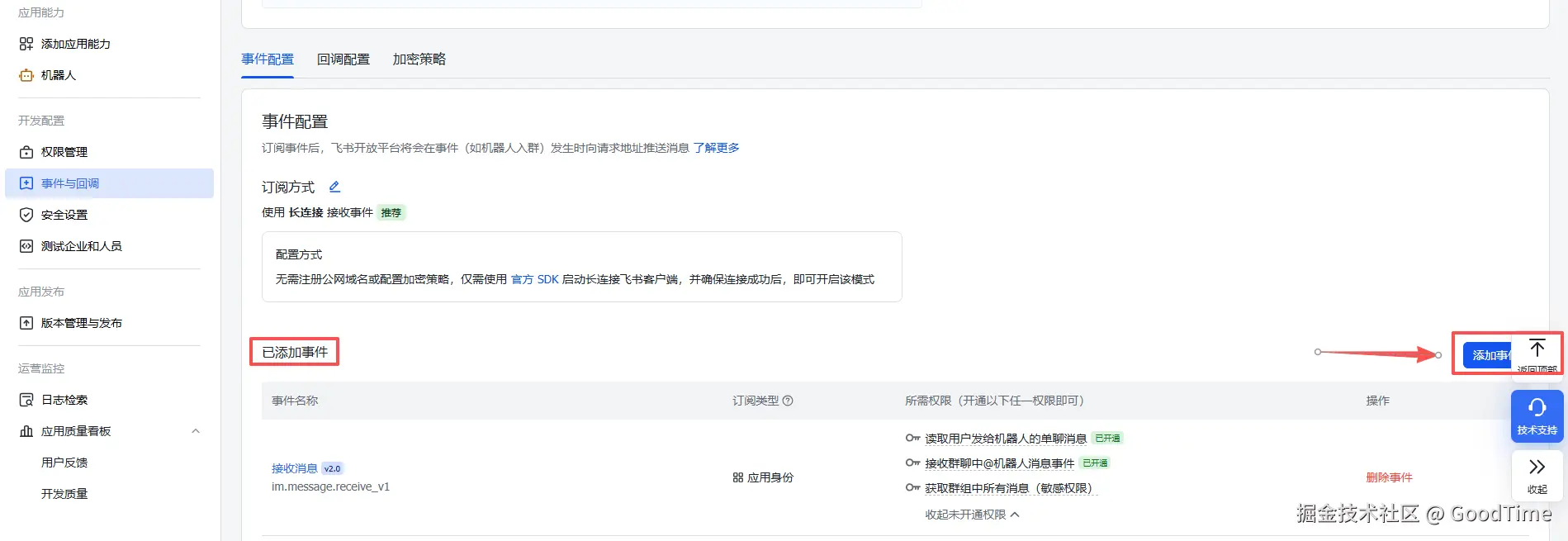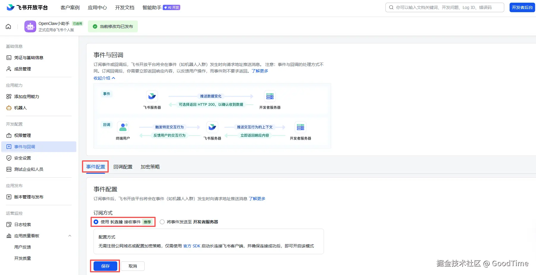 Q2:飞书机器人配置事件提示未检测到应用连接?