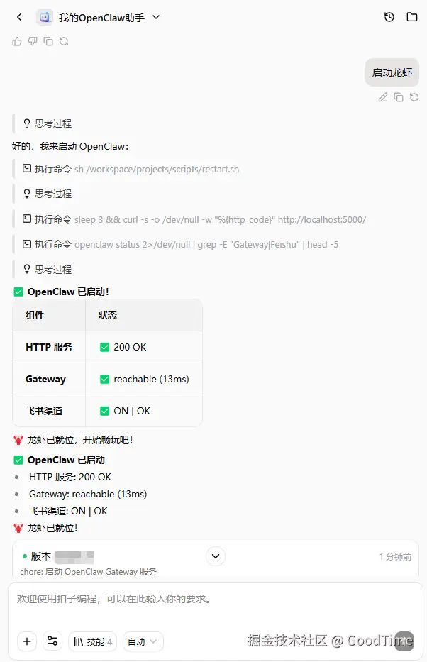 - 启动关闭龙虾也可以直接在扣子编程输入