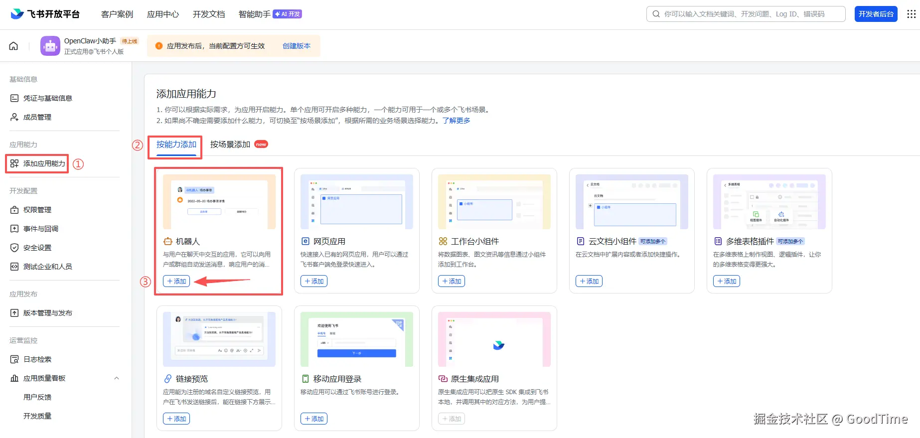 再次进入飞书开放平台,选择自己的机器人应用