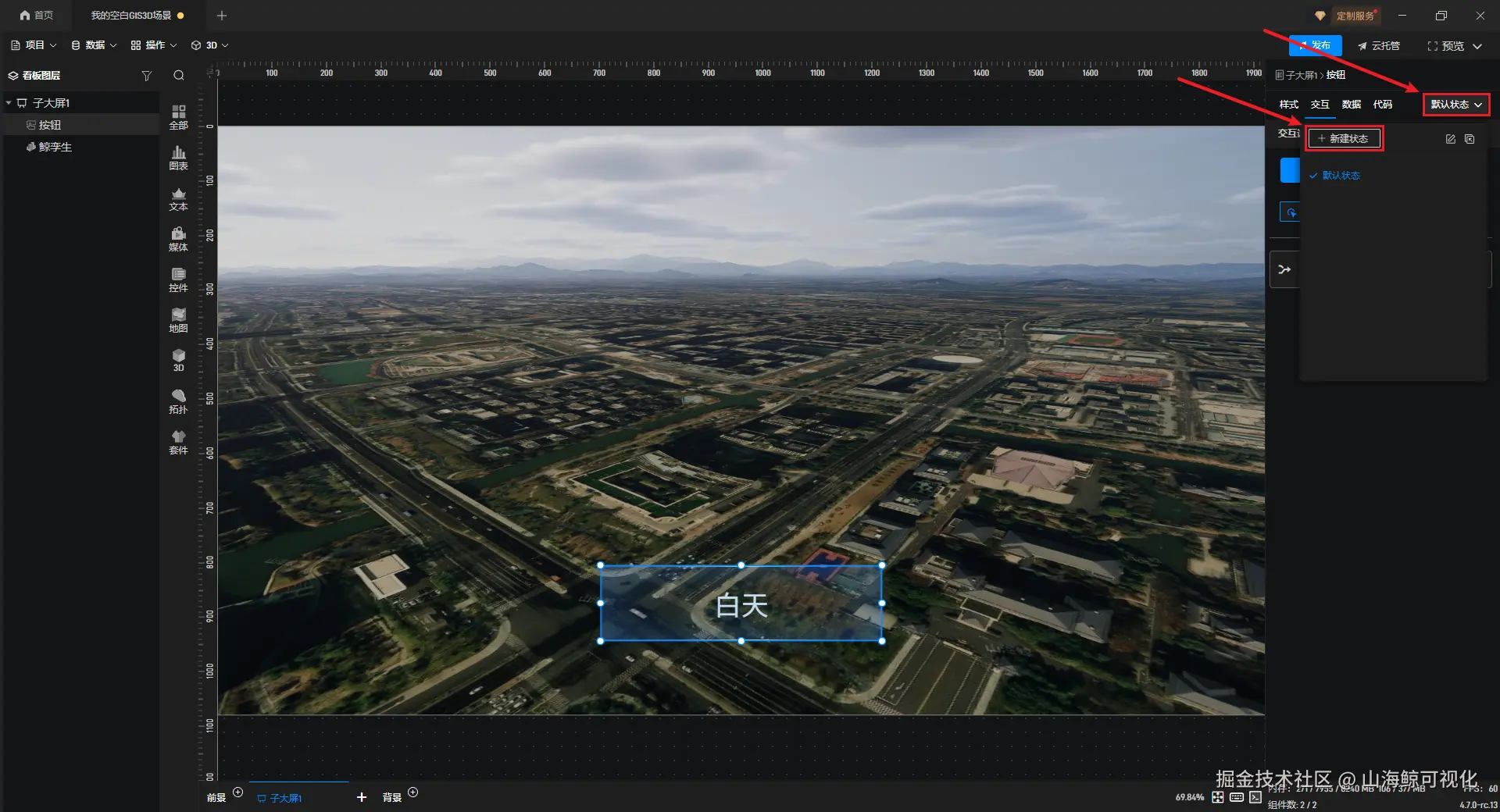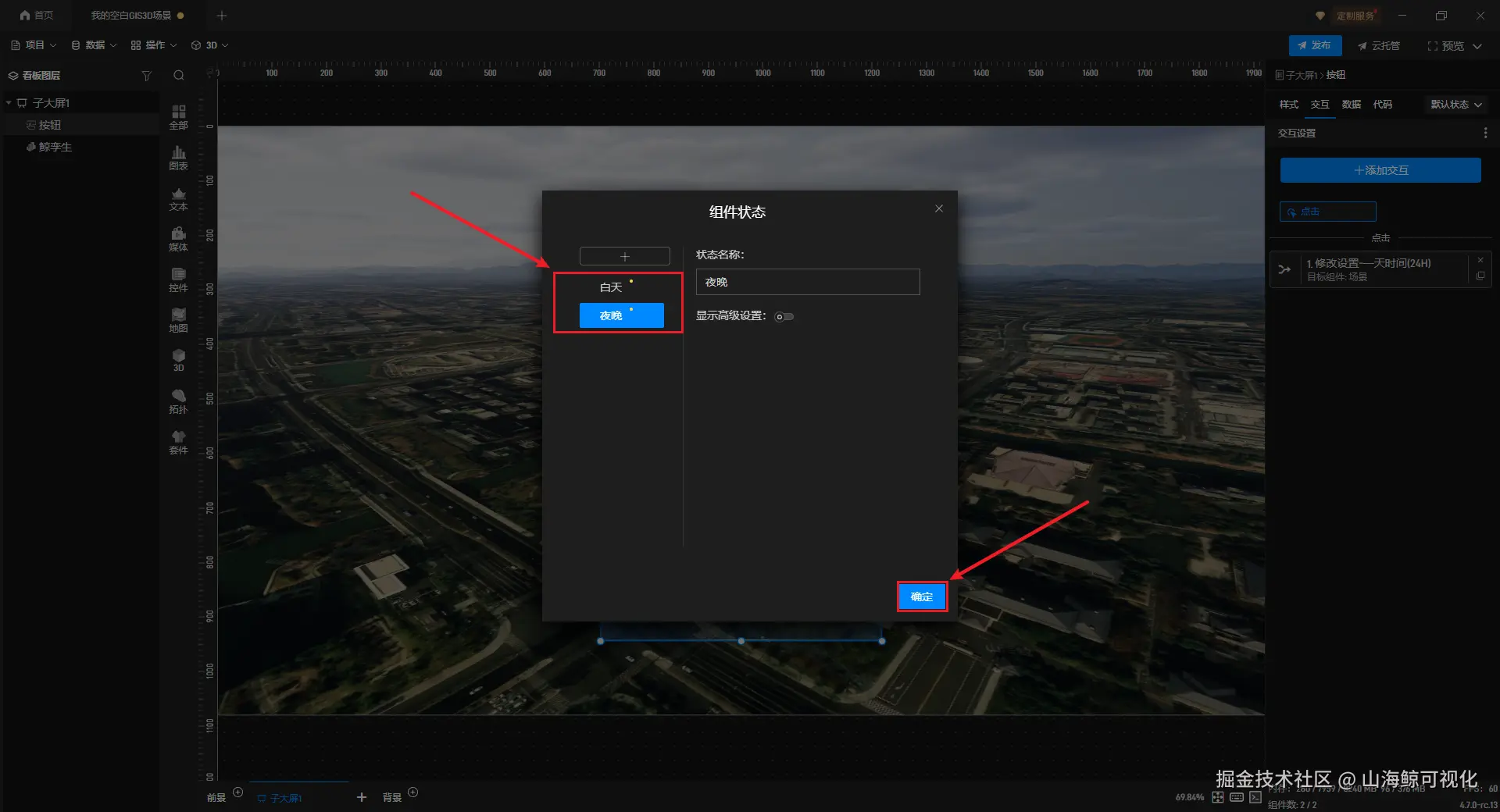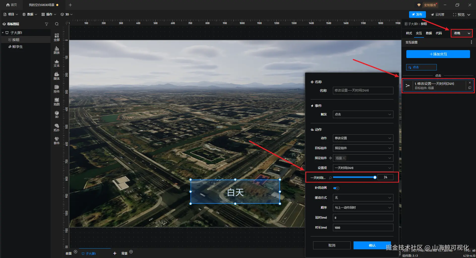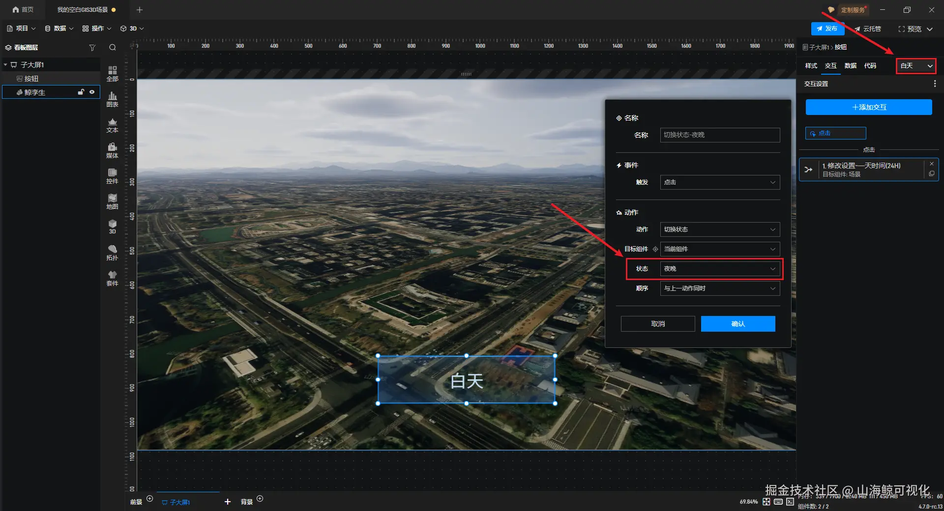 打开 “交互” 设置,为 “按钮” 组件添加将场景切换为白天的交互,如下图所示: