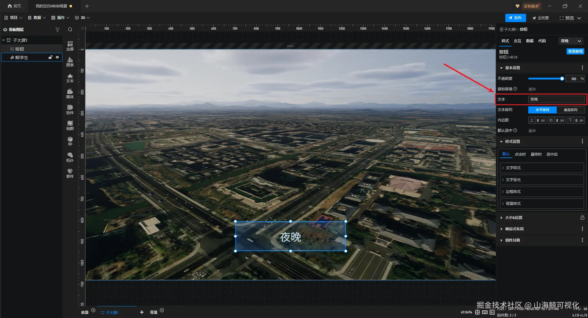 添加完成后,修改 “按钮” 组件的显示文本,改为 “白天” 。