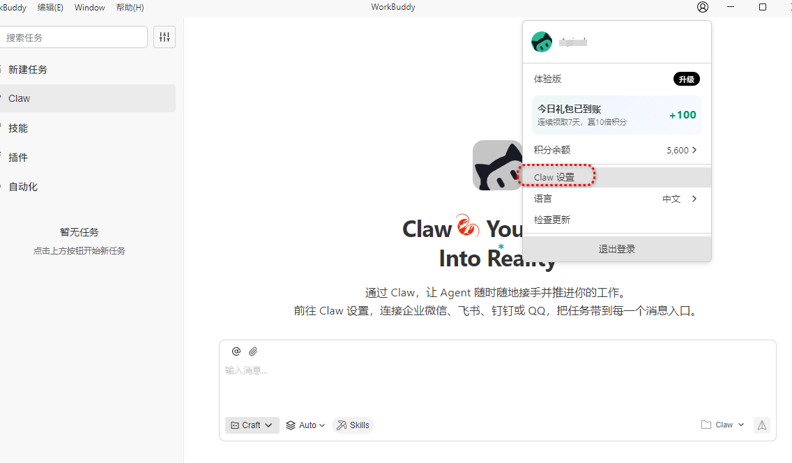 点击头像选择Claw设置
