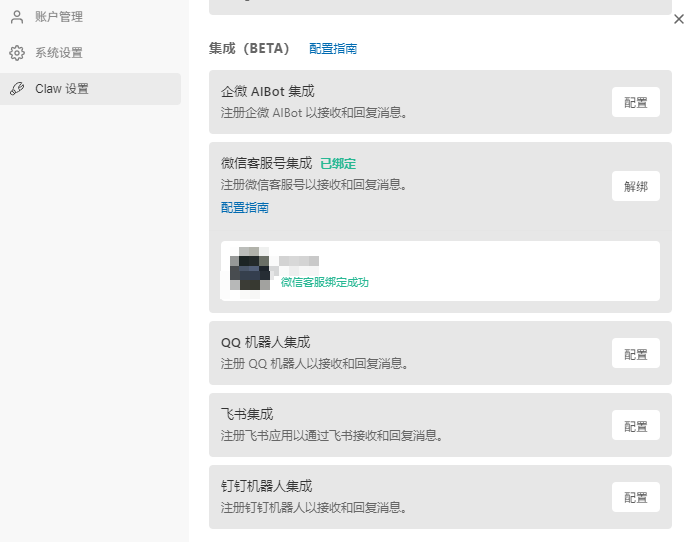目前这里支持微信QQ飞书钉钉和企业微信,基本上国内的全生态支持,还是很方便的,但是每个平台没办法设置多个机器人,只能配置一个。