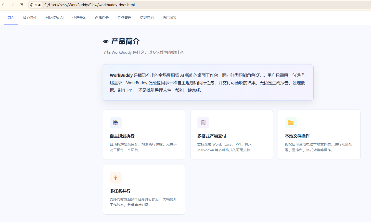 下面是我刚刚一句话让它写的关于workbuddy的文档,它给我的是一个html网页,这里做的还挺好的,这里它介绍了一下自己的功能:生成报告、处理数据、制作 PPT和批量整理文件,有这方面需求的朋友可以体验一下。