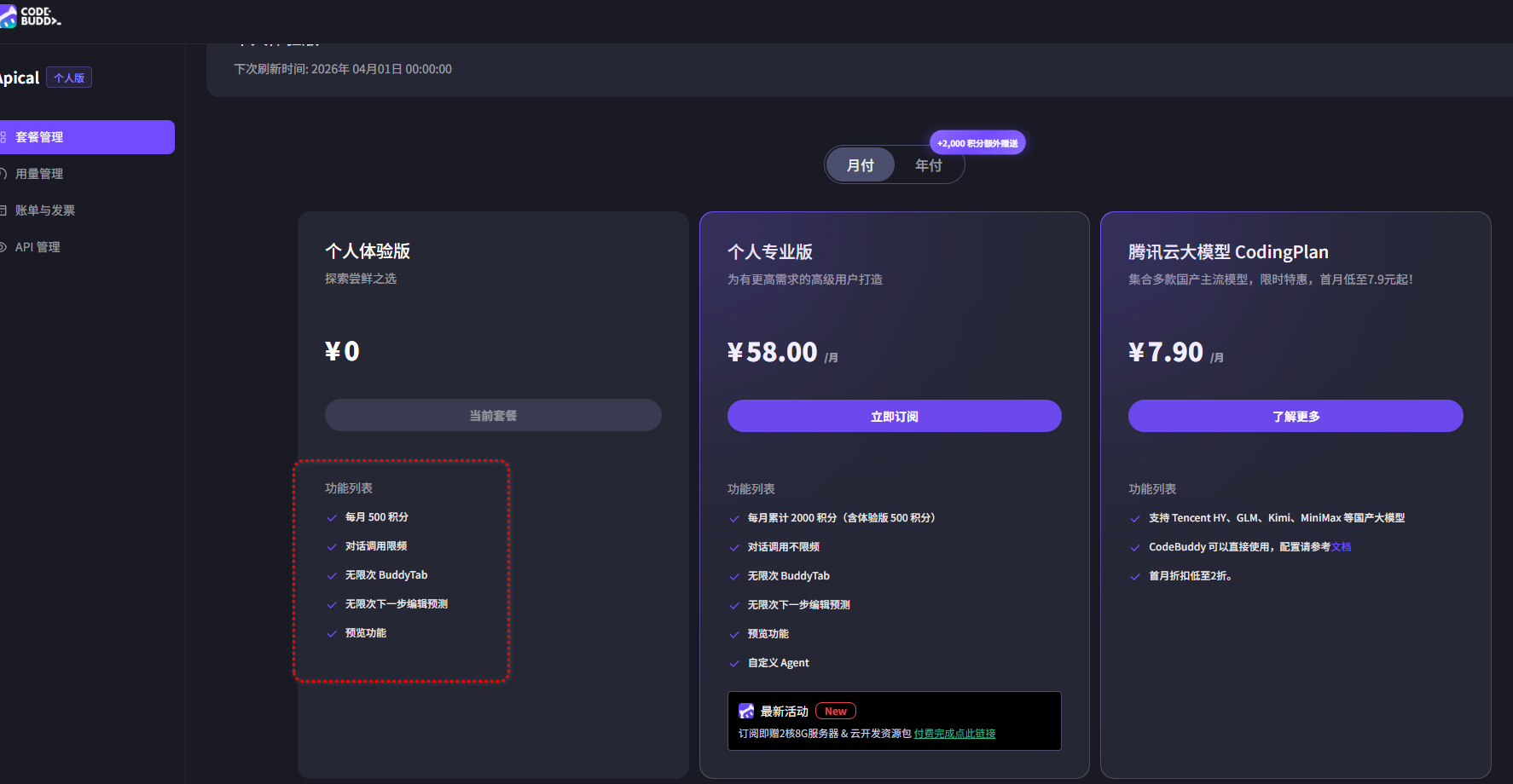 新用户免费送了5000积分,加上体验签到还有积分,还是可以体验一下的,这里的个人专业版还是有点贵的,如果能用coding plan计划就好很多了,可是现在缺货了。