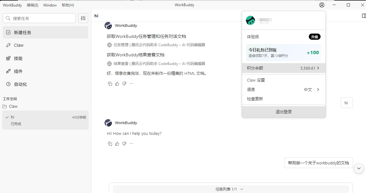 对于大多数人来说,这才是真正能用的 AI 工具,它不像 OpenClaw 那样需要你懂技术、会配置,而是真正站在普通用户的角度,把复杂的东西简单化了。 新用户 5000 积分的体验额度也够实在,几句话写个文档也就消耗 30 积分左右,日常用完全没问题。虽然专业版价格偏高,但如果你只是想体验一下微信里养龙虾,这个免费额度已经够你玩很久了。