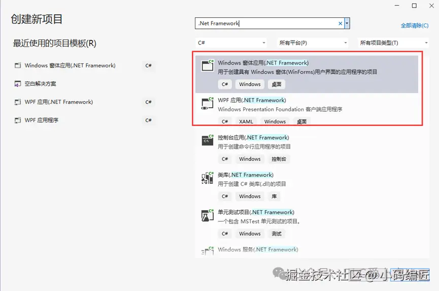 使用 Visual Studio 创建基于 .NET Framework 的 WinForms 应用程序(WPF 同理,但 UI 控件不同)。