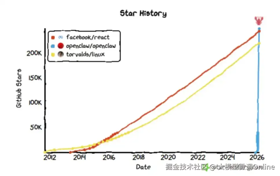 这种“雇了一个数字员工”的体验,让OpenClaw瞬间击中了所有人的痛点。3月1日,它以25.2万颗星登顶GitHub软件星标历史第一;3月6日,近千名开发者和AI爱好者在腾讯大厦楼下排队完成云端安装。目前它已成为GitHub历史上增速最快的开源软件项目。