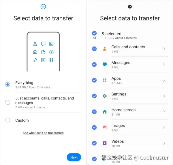选择要传输的内容,例如联系人、消息、应用程序、照片和设置。