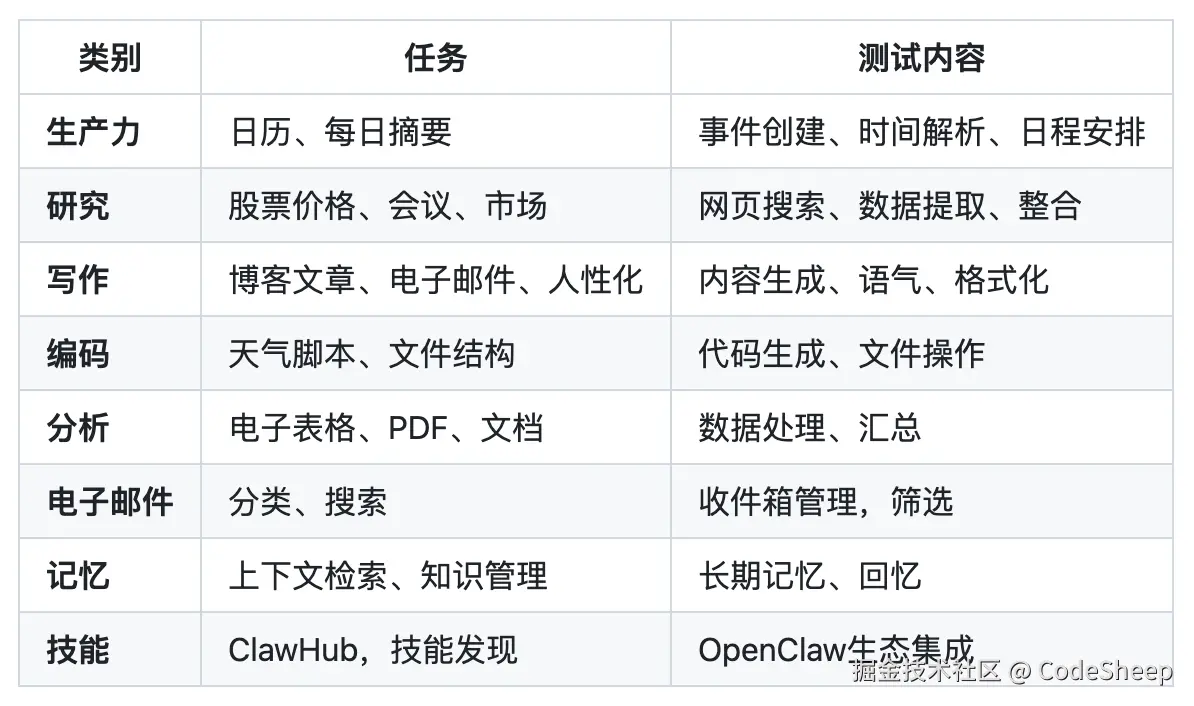 不同于传统的数学推理或知识问答测试,它非常硬核。因为它专门设计了二十多项跨场景的真实任务流,比如自动写代码、文档处理、工具接口调用、处理邮件……等等,来评估不同大模型在 OpenClaw 框架下的真实执行力。