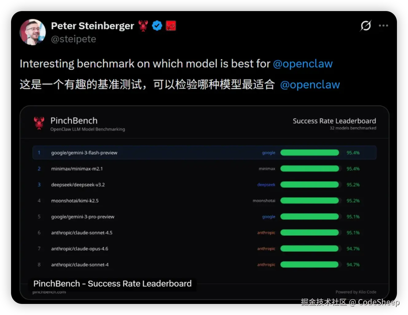 那关于这个问题,就在前两天,OpenClaw 创始人 Peter Steinberger 亲自在网上发了一个专为龙虾而生的 OpenClaw 大模型适配榜单,其中国产模型两个进了前三。