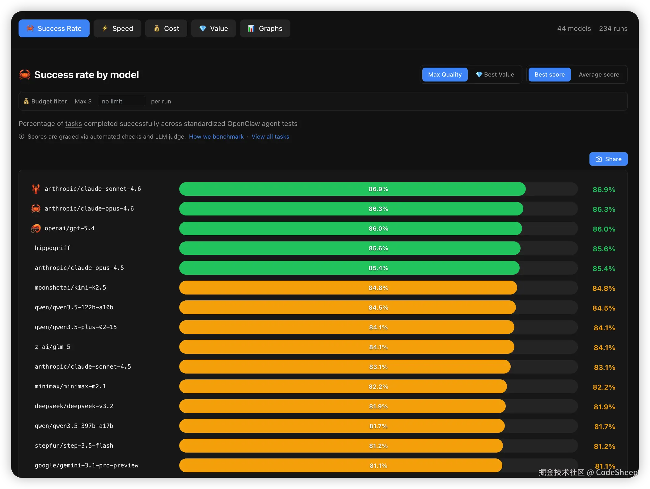 在 PinchBench 的评测维度中,成功率(Success Rate)是一个核心指标,在这份测试了全球 几十款主流模型的榜单中,竞争极其激烈。