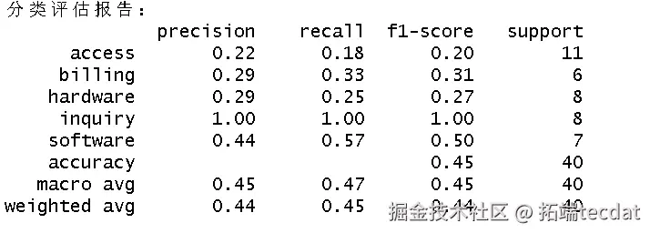 由于数据集较小(仅 100 条),且标签分布不均,模型整体准确率约 45%,但 inquiry 类别表现优异(精准率与召回率均为 1.0)。这验证了 LLaMA 提取的特征确实为分类器提供了有效信号,尤其是文本中蕴含的语义信息被转化为数值特征后,显著提升了易混淆类别的区分度。在实际业务中,只需扩充数据规模并优化特征设计,即可获得更可靠的模型。
