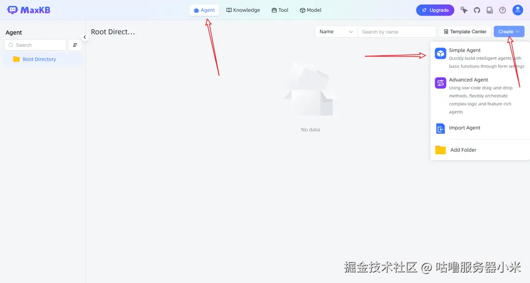打开顶部 Knowledge 页面,点击 Create 创建知识库, 这里选择 Web Knowledge。