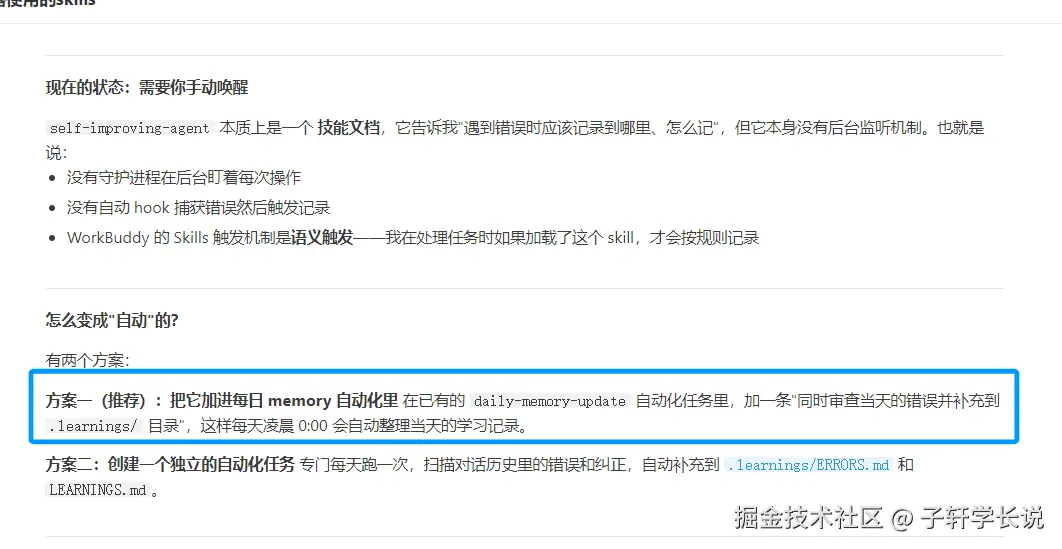 然后还要具体要求它把每天使用self- improving的技能与写复盘的能力一起触发,这些你都只需要和它对话聊天就行,真的没什么特别的提示词。
