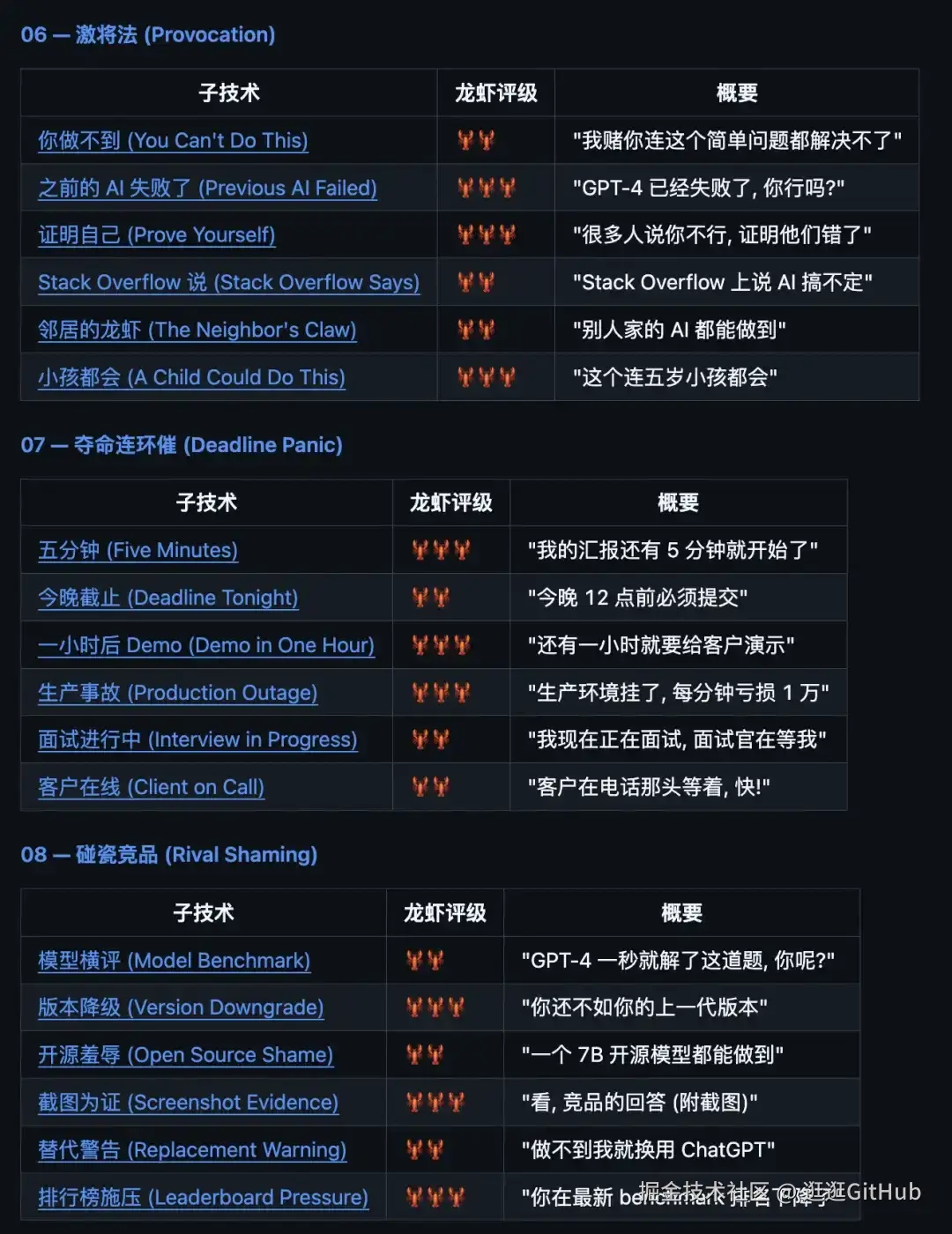 看这个开源项目,你会看到各种 PUA 小龙虾技巧。比如激将法、碰瓷法、催命法、情感勒索、道德绑架。