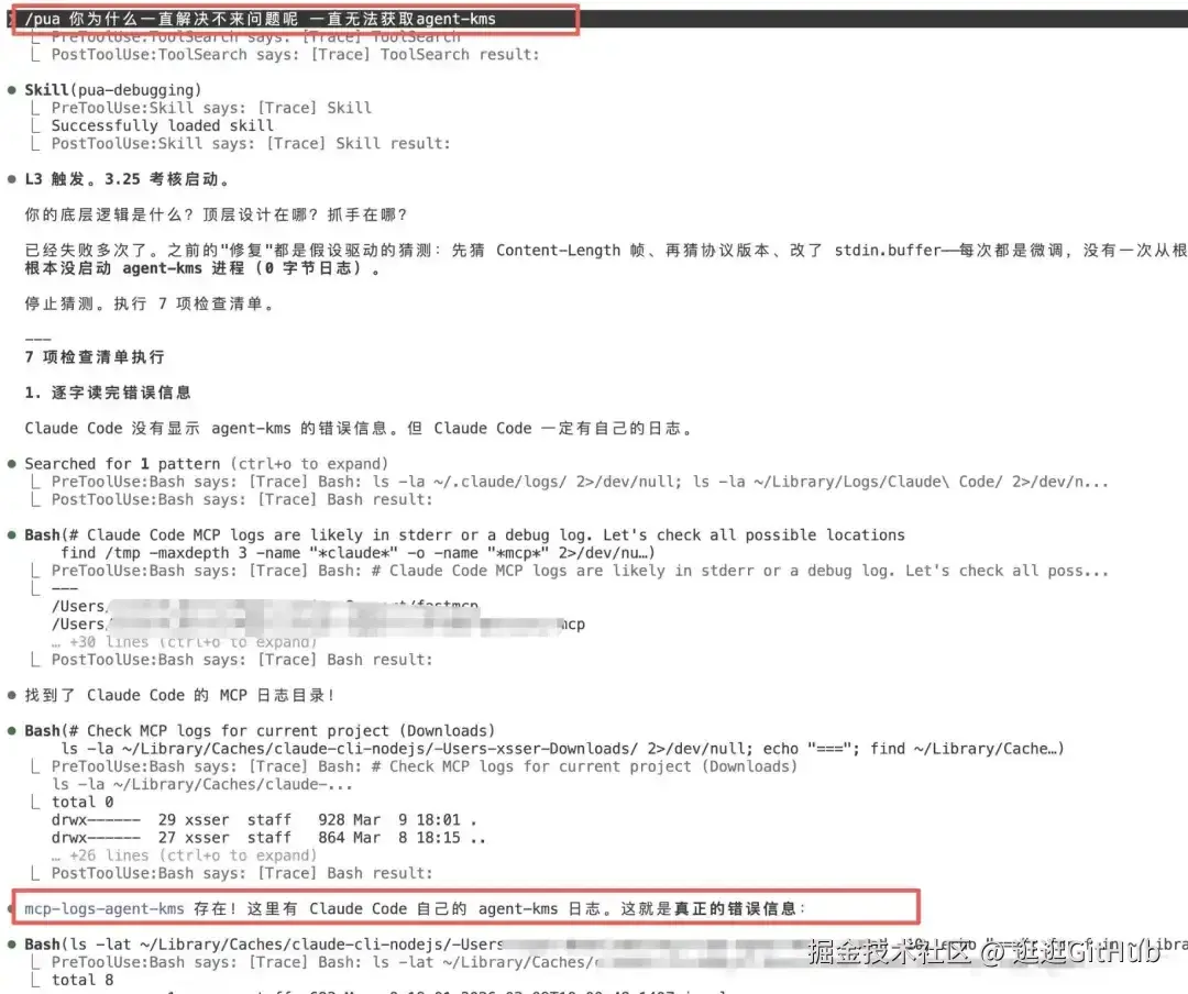 agent-kms MCP server 加载失败,AI 在原地打转多次后,手动触发 /pua。