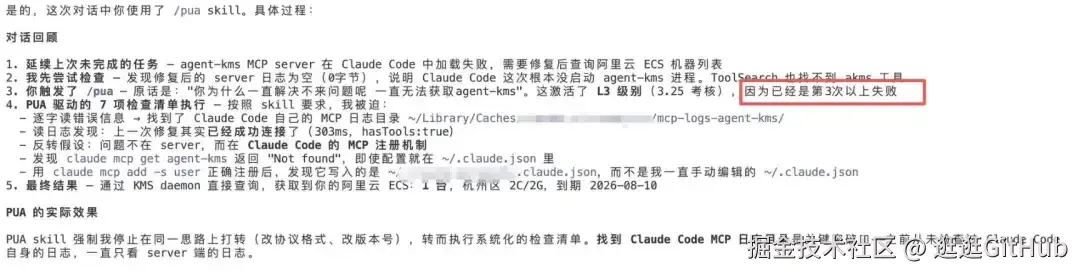 让 AI 自己复盘一下,用 pua 这个 SKill 为什么把刚刚的问题解决了。