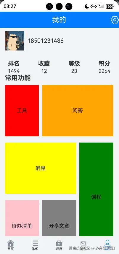 功能包括登录,首页,体系,项目,我的。