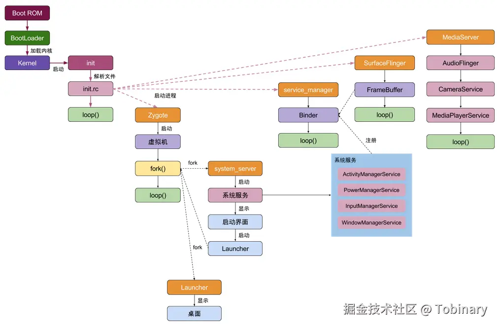 - 启动系统服务:servicemanager、adbd、surfaceflinger、zygote......