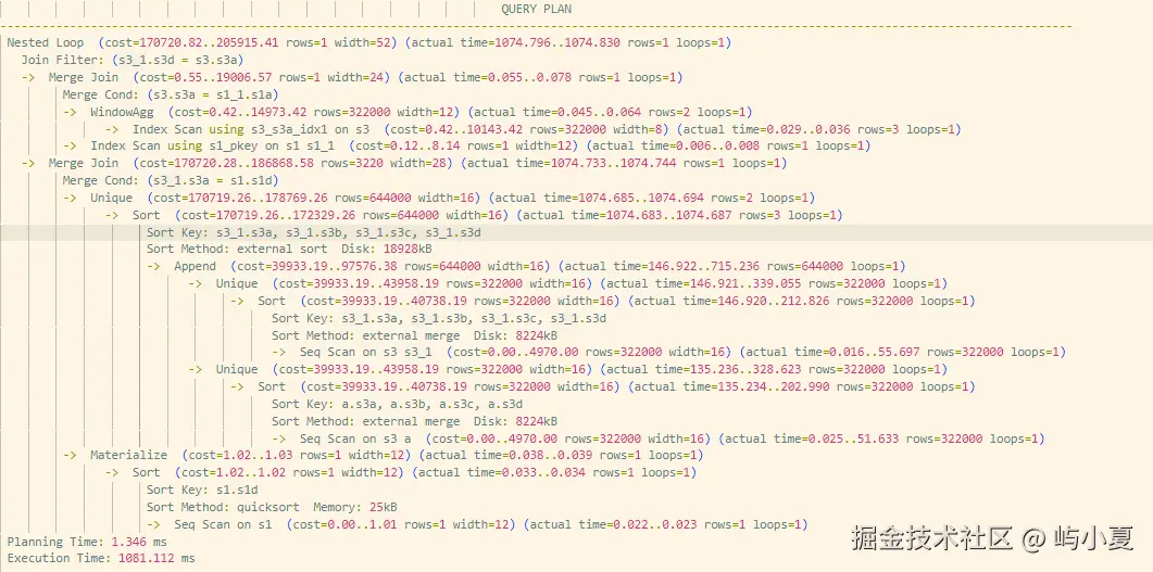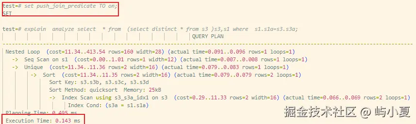 分析:下推后,子查询在扫描阶段即利用 s1.s1a 的值进行过滤,避免了无效数据的去重计算,中间结果规模急剧缩小。