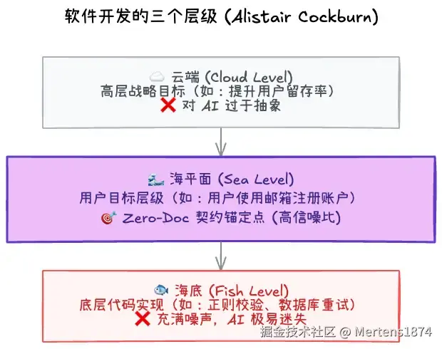 Spec Coding 强调将我们的意图锚定在“海平面”上。在这个层级,我们既不谈论虚无缥缈的愿景,也不纠缠于具体的代码实现,而是清晰地描述用户试图通过系统达成什么具体的、可观测的目标。